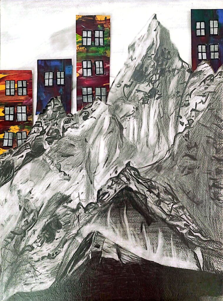 This piece reflects the relationship between nature and urbanisation. The detailed graphite mountains embody the raw presence of nature, while the vibrant, structured buildings symbolise human expansion. The contrast between the organic and the constructed invites contemplation on co-existence, progress, and the evolving landscape we inherit.