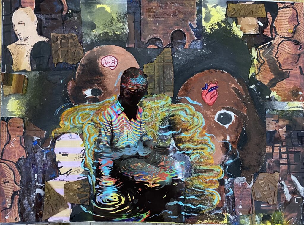 This painting depicts dark and light colours showing the journey from trauma to healing. Cracked, broken textures in the background resemble ruins, symbolising the fractured state of the soul after trauma. However, the vibrant colours and flowing lines represent flexibility and hope growing among the wreckage. The exposed brain and heart convey vulnerability, yet their bold depiction shows strength in this openness. The tension between decay and vibrancy illustrates how hope persists, even among the ruins of the soul, suggesting the possibility of healing and rebirth. The painting represents the positive aura that one has and the effect of it on its surroundings. The dark in the back reflects the mystery of life, the thoughts of the mind, and the confusion of survival.