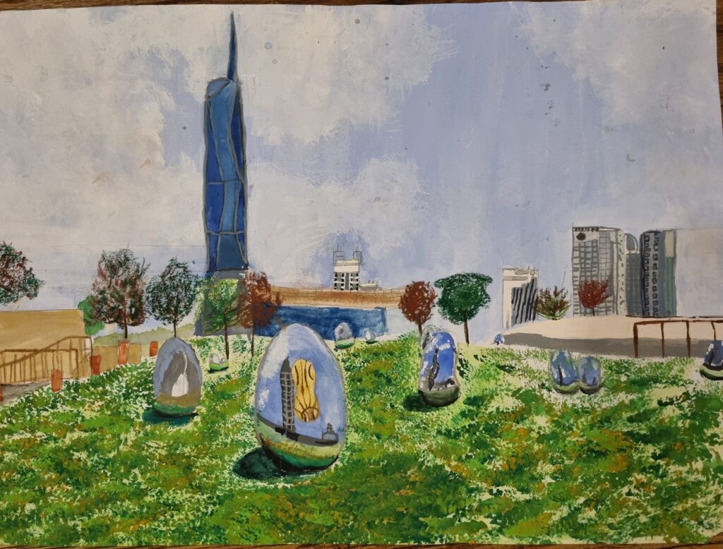 I chose to paint Merdeka 118 because it is the tallest building in Malaysia and is surrounded by lush greenery. I used paint, oil pastels, and acrylic markers to create this piece