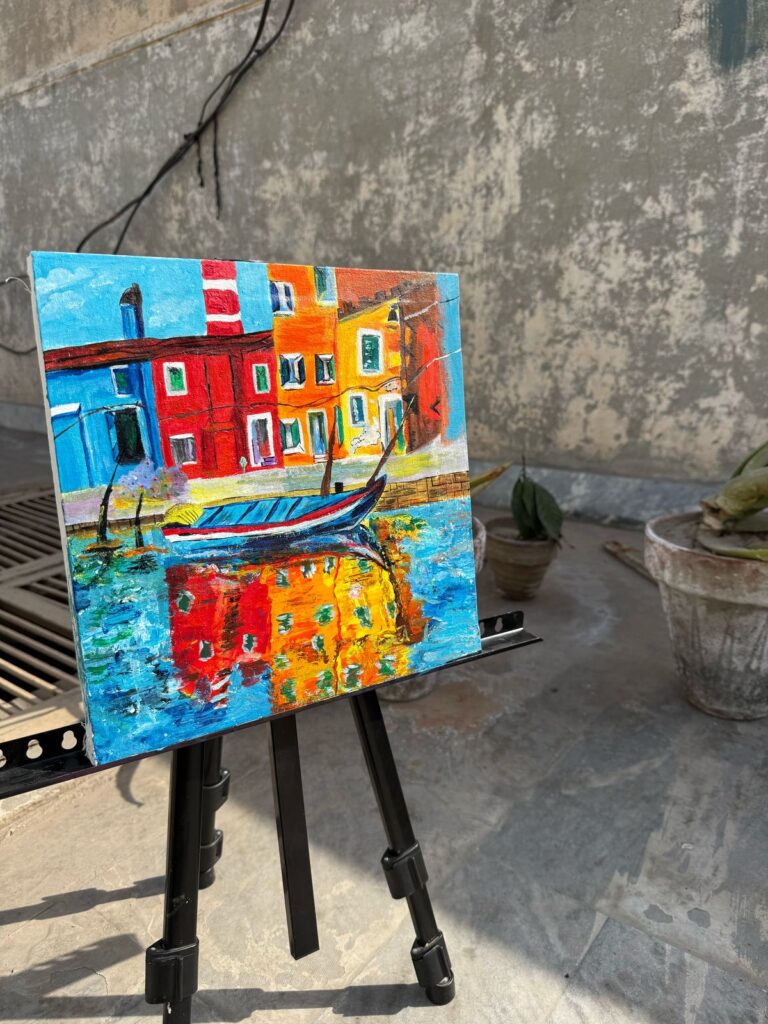 Reflection is always beautiful when it appears on water, whether it’s blue or colorful. There isn’t a big story behind my artwork, but I’ve always loved observing the reflection of boats during my visits to the northern areas, where I had so much fun boating on the lakes. I initially wanted to add a sunset, but then decided to go with something different and more colorful.