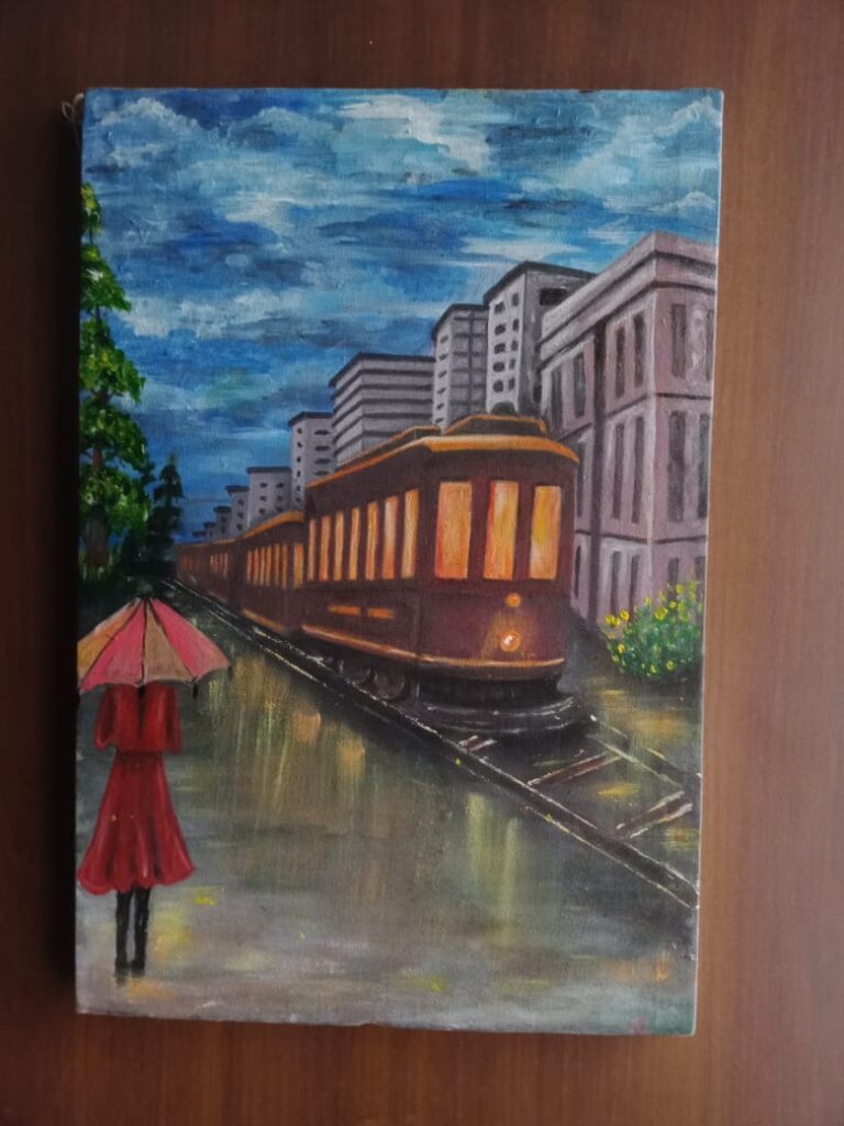 This painting shows a rainy day scene in a part of the city. It illustrates how rain transforms the city’s view, making it softer and more colorful through its reflections. The girl holding the umbrella represents people reflecting on themselves when they are alone. This artwork is mainly about finding beauty every day in the smallest and simplest things, and taking time in this busy world to pause and think about yourself.