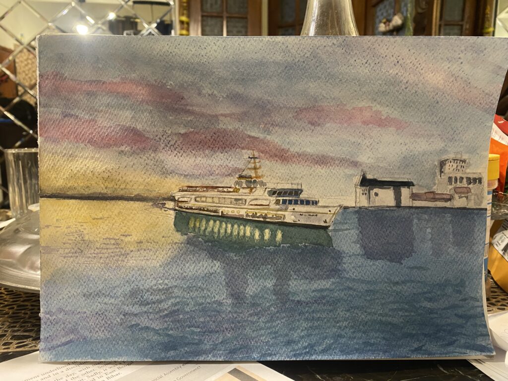 This piece is a reflection of stillness amidst movement the ship continues its journey, yet the surrounding atmosphere remains peaceful and undisturbed. Through watercolor, I aimed to evoke a sense of tranquility and wanderlust, inviting viewers to pause and appreciate the quiet elegance of travel, reflection, and the endless horizons ahead.