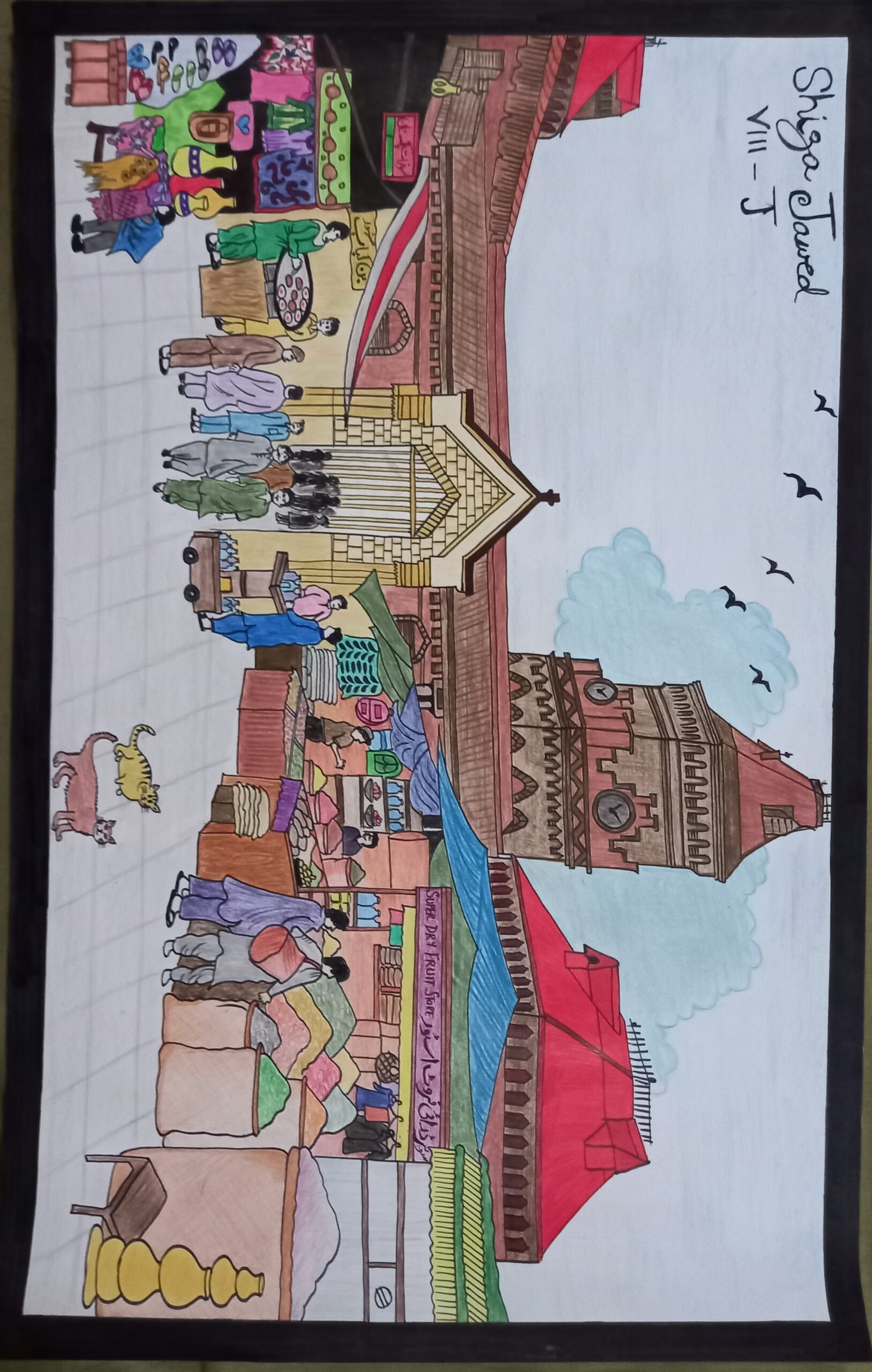 My masterpiece is about the “Tower Bazaar Of Karachi”. To create my drawing I visited the tower bazaar and then I drew what I observed. My drawing depicts how so many shop and stall owners go there everyday and work so hard to earn a living. It shows the hard earned life a normal Pakistani man. My drawing shows the Pakistan’s specialties things such as dry fruits, spices, cotton, clothes and mud pots. The place which I have drawn in tower bazaar in Saddar Karachi. It is always crowded and has a lot of stuff for everyone. Our country being a developing country is struggling hard to survive despite being rich in a lot of things such as cotton, spices, leather, grains and a lot more. Our poor workers sell these stuffs in these kinds of markets which I have shown. I have drawn how so many people meet up at the market and might remember their old times or might discuss their life with each other. I have also drawn people buying things while bargaining to save a little more. And there is also a drink seller to beat up the everyday heat of Karachi. So basically, I have drawn an everyday of a market of our beloved Karachi. May Allah bless our home Karachi.