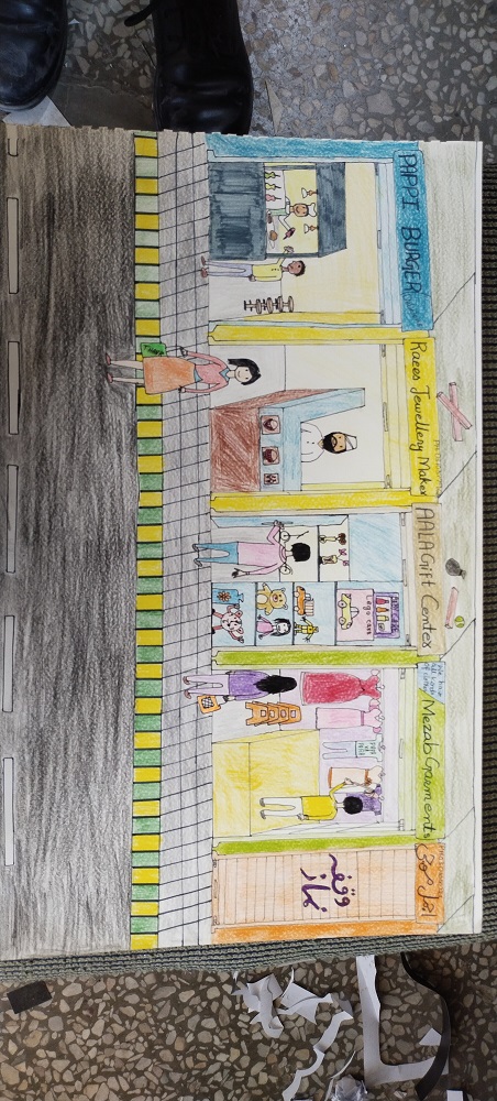 This drawing is done with colour pencils and colour markers to show the life of karachi’s bazaars.