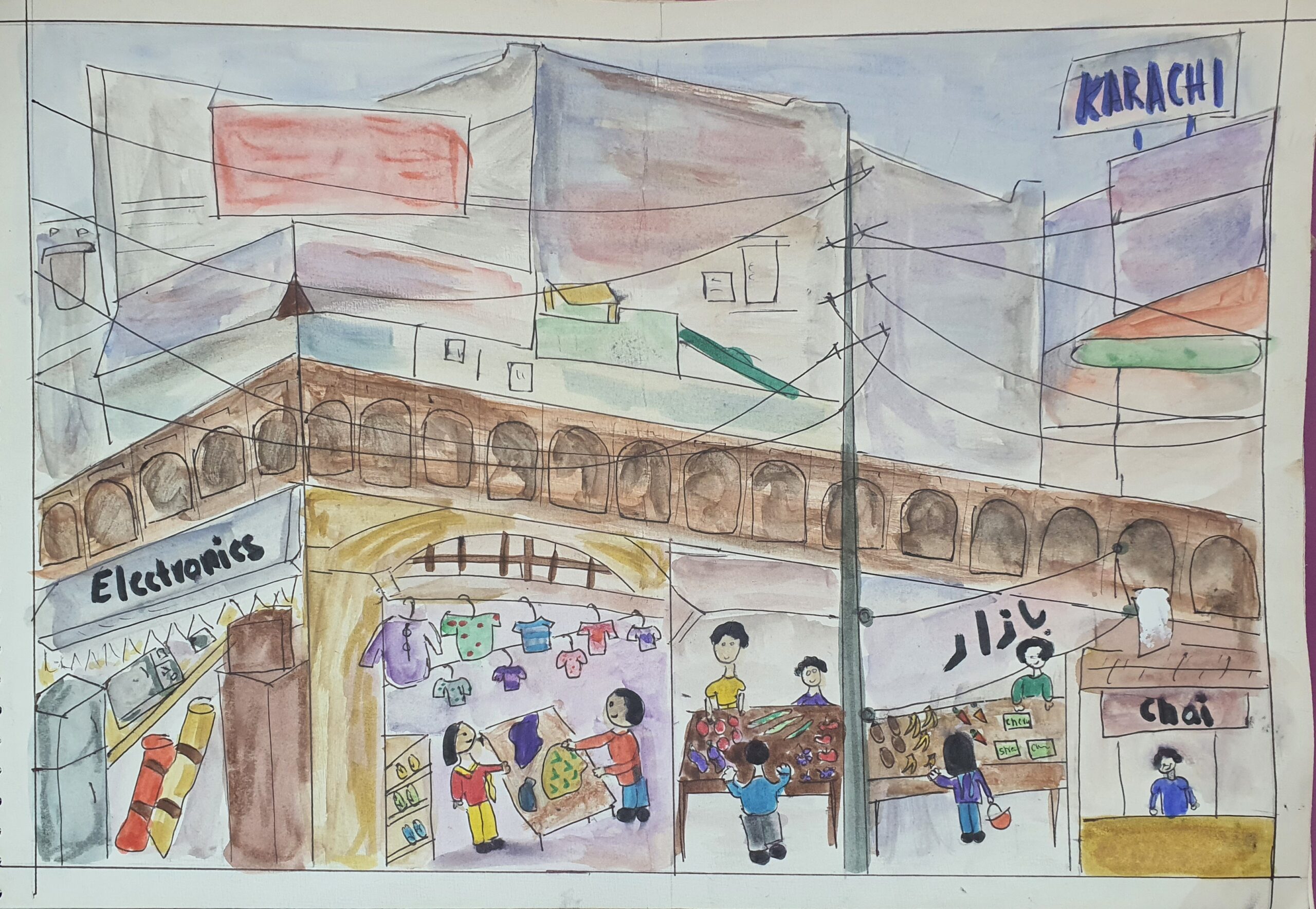 As I chose the category of 2D painting I first drew my sketch on how I wanted it to look as I already had a picture in mind but I did not know how it would look on paper. I did make some changes and when I happy with the result I traced it all with a pen and then used watercolors to give color to my drawing. My art work explains the markets or bazaars of Karachi how they look and what they show. I wanted to give my art the reality of an actual bazaar and all rush and excitement it has.