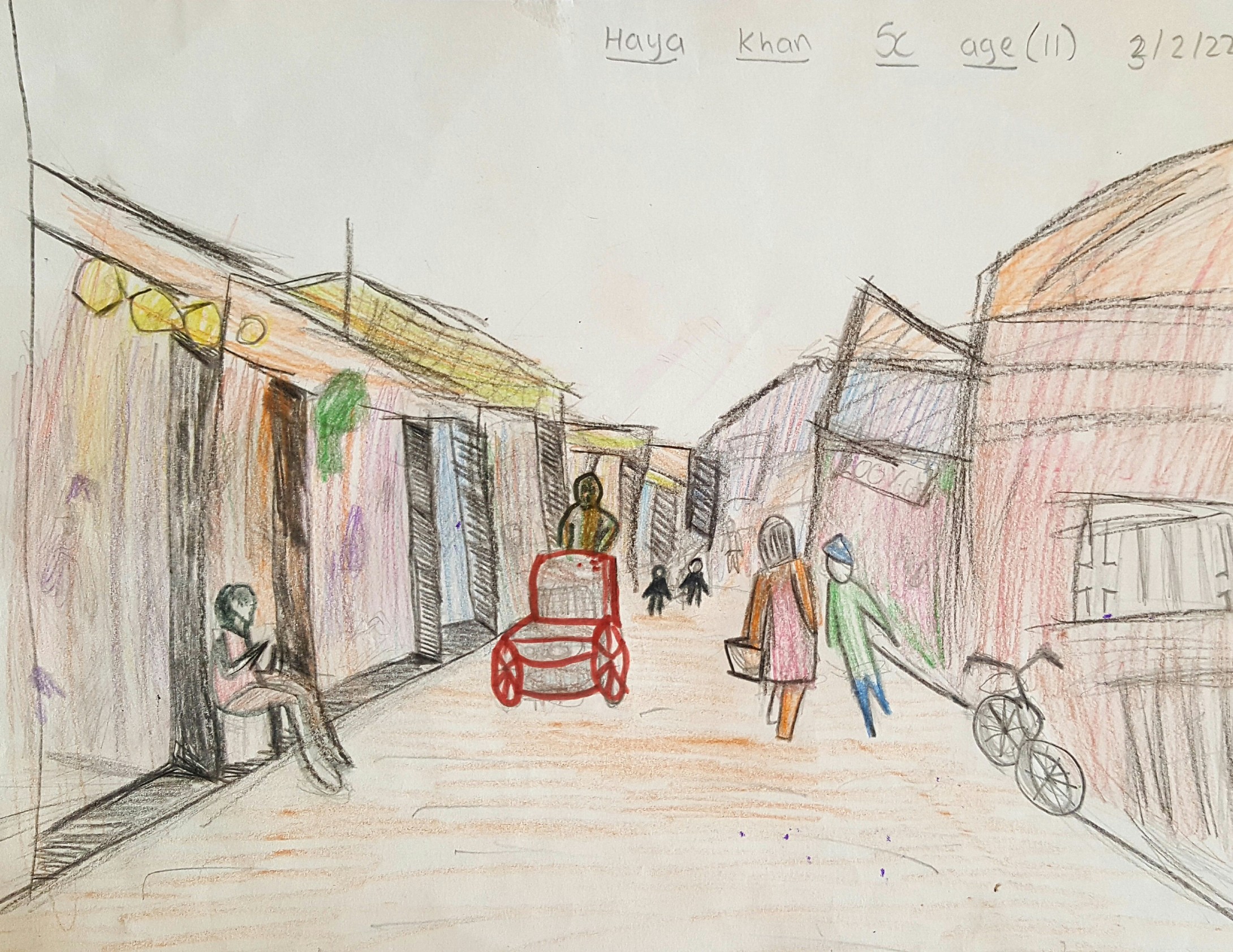 The theme of my art work is Bazaar of my City, So I drew the the bazaar near my house where I and my parents go for household shopping. First I drew this artwork with pencil then I applied two mediums, Watercolors and pencil colors.