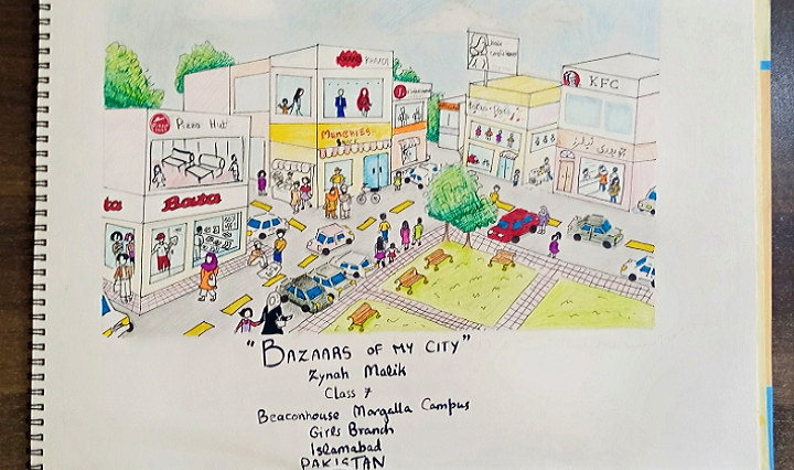 My art piece is about a bazaar from Islamabad in Pakistan. I took inspiration from the bazaar in F-10 markaz and turned it into a 2d art piece made with colour pencils and pointers. I added colours to make it look vibrant and black outline to make it look sharper. In my opinion, if you want to make it look atracttive, you add vibrant colours and make it look saturated.
