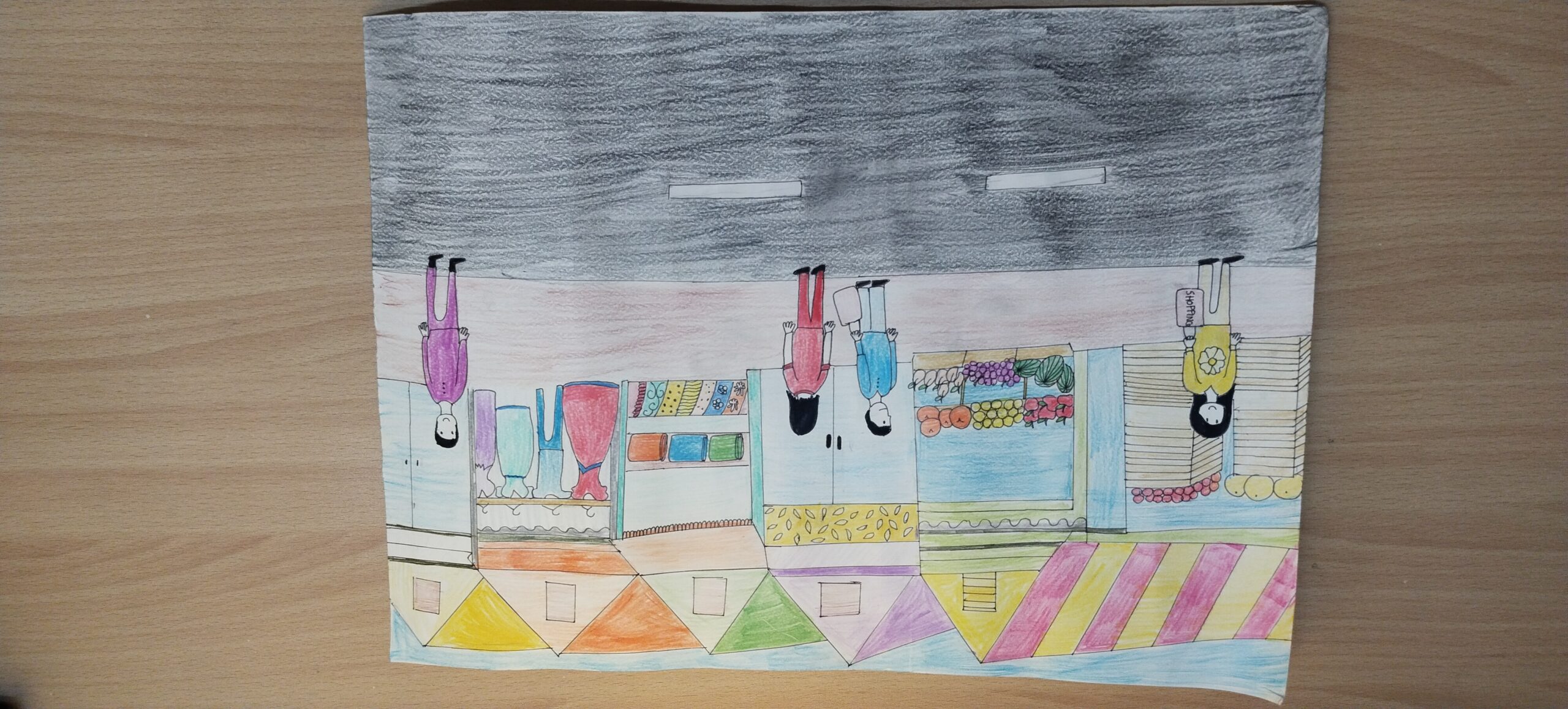 My drawing is capturing a view of modernized market of Karachi city where in the big posh buildings the items like fruits, vegetables, clothing and many more things are sold in well civilized manner and displaying a variation of seller and their captivating techniques to attract their costumers.
