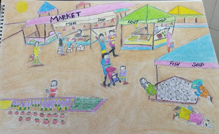 Market is a place where people buy everything. market is a very useful place there are a lots of shops people come to market for buy things such as fruits, vegetable, meat etc. I have tried to draw a market present in my area.