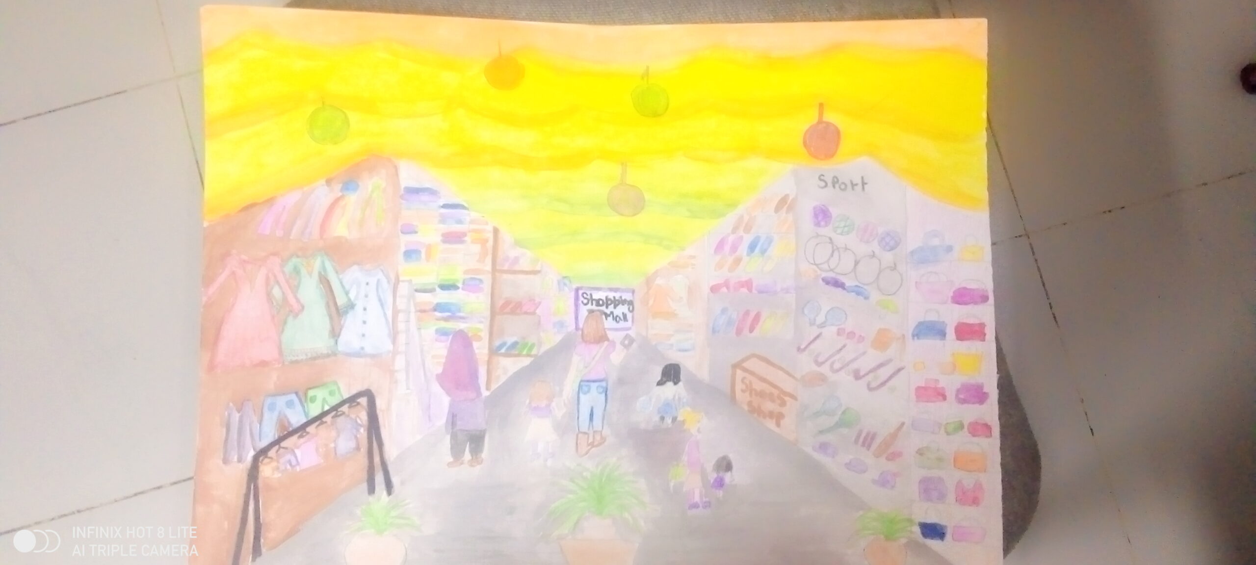 this is a painting of a bazarre which has a tint of a modern shopping mall to it, it was created on 3 March, it is a bazarre which sells bags, clothes, shoes etc. there’s also a bit of a traditional style to it and my mom helped me in creating this but overall I tried to do this all by myself because it was my competition so I hope you like it!