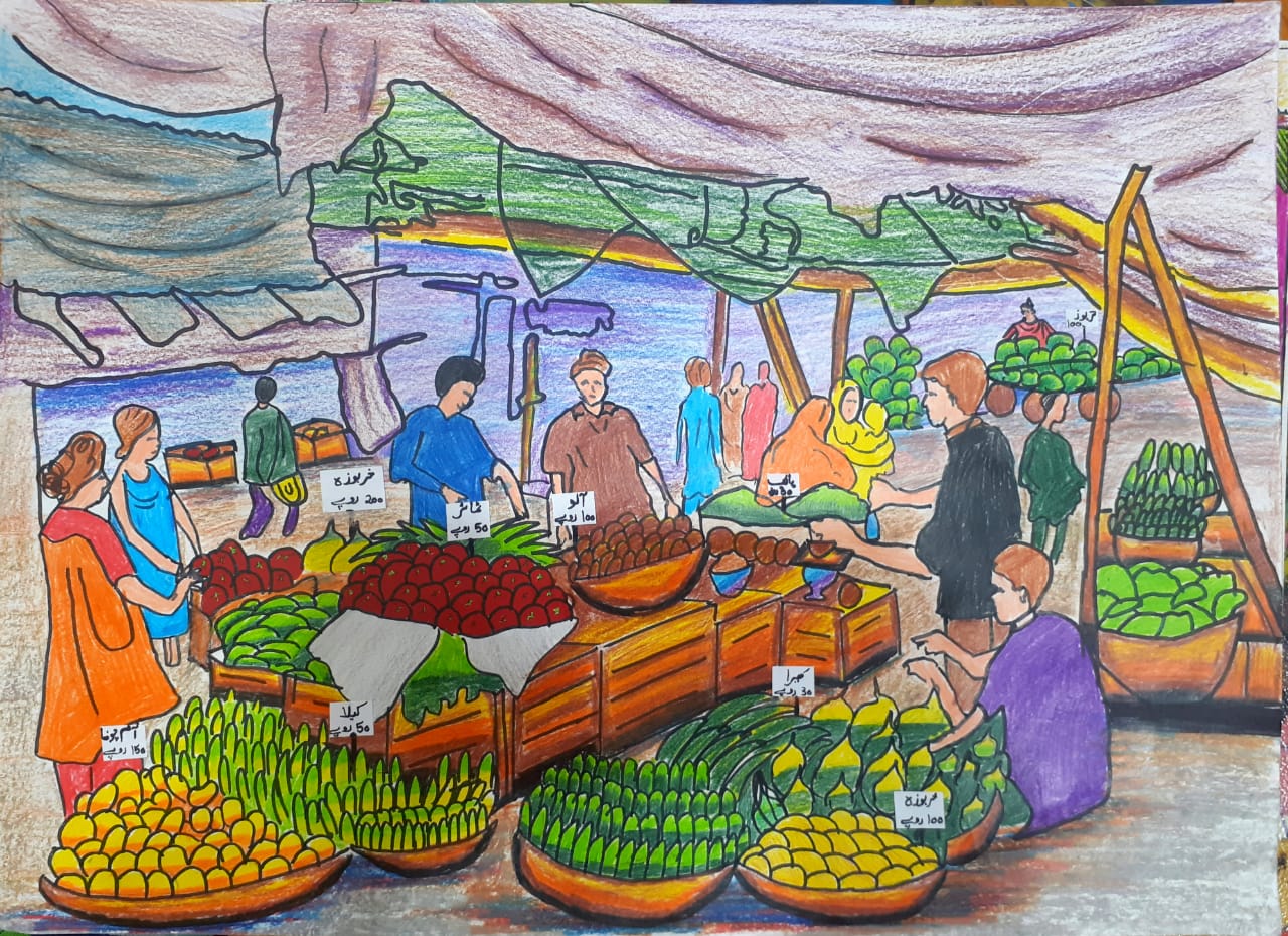 I accompanied my mother to buy vegetables from the market on Multan Road Lahore. The place was a bustling hive of activity with the sellers and byers negotiating the rates. Not a single shopkeeper was seen sitting idle. Venders chanted loudly to attract the sellers. However the impressive thing in the market were wooden vegetable crates overflowing with vibrant colour vegetables. Even the basket of bitter gourds looked tempting. I have tried to capture every essence of the market in my drawing .