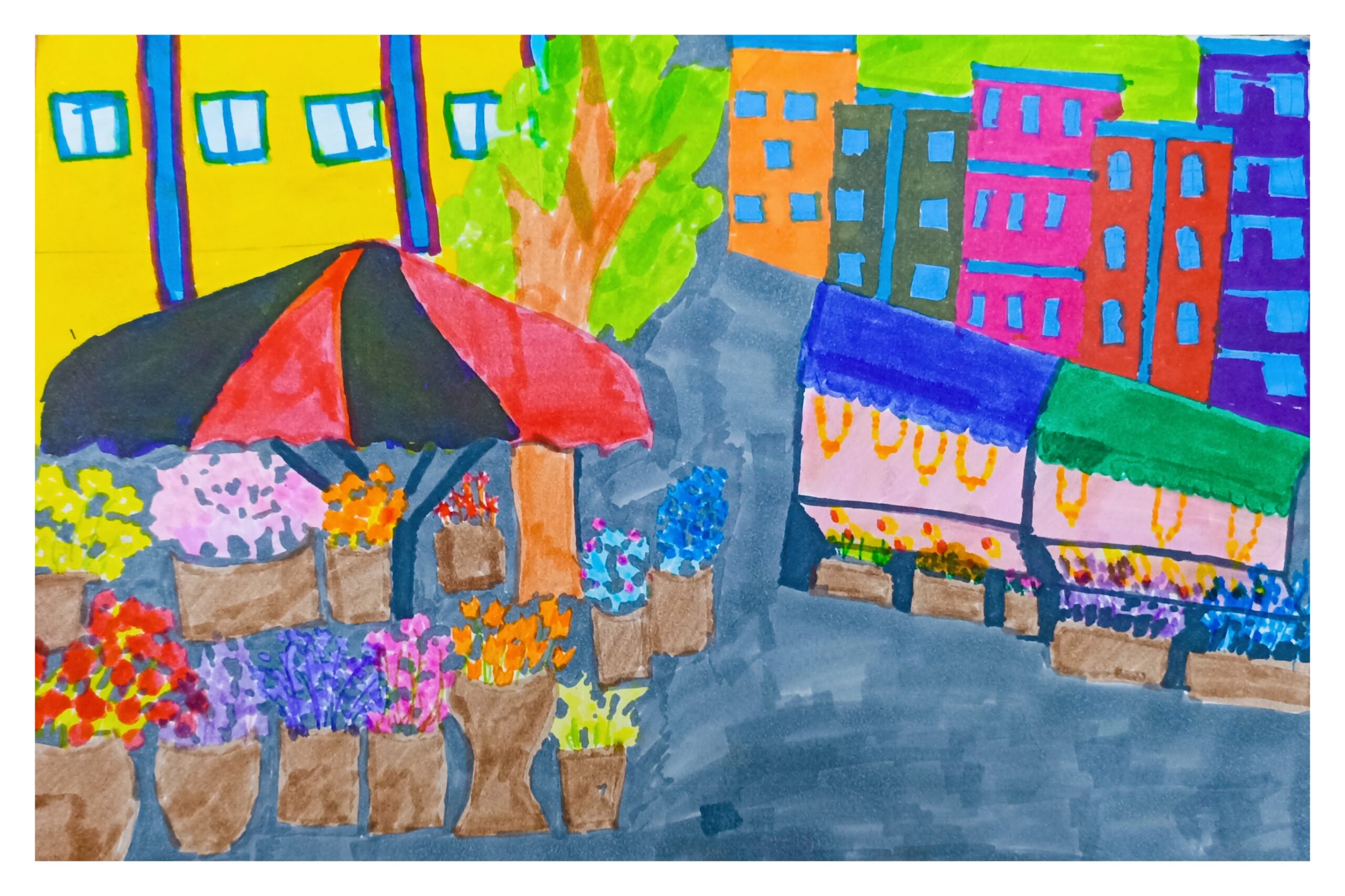 Art is a way to find your creativity and express your feelings from it. The art you create can be expressed in many different ways, it depends on where you live, how you live or what you think. So on this theme BAZAAR, I chose the place I live and the environment I see or feel. My market is of flowers as I am in love with nature. Flowers has a beauty that can’t be expressed through words but surely from an art. The thing that attracts me to flowers is their uniqueness, colours and aroma or scent. It feels such a pleasure and relaxation when my eyes lay on them and smell the different flowers smell. This is a scenery my mind creates when I think of flower market