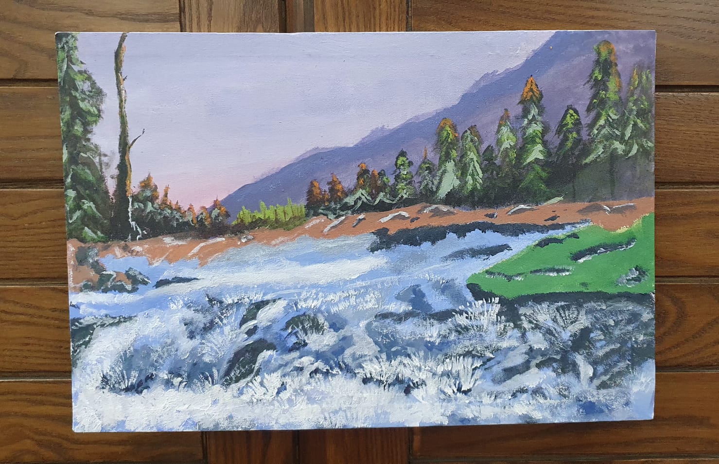 This artwork depicts a serene cascade landscape, created using canvas and acrylic paint in primary colors. By skillfully blending these primary colors, various hues were achieved, including shades of brown, orange, baby pink, and more.