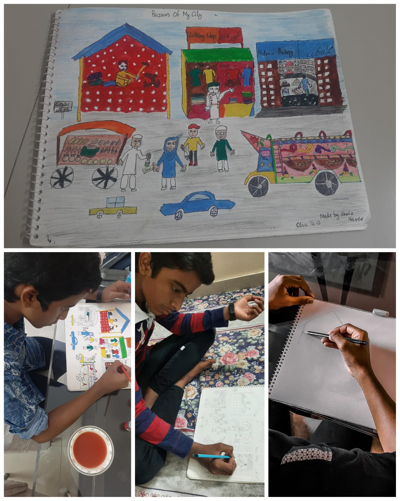 This is my drawing of the Karachi Bazaars. These bazaars may be found in some other parts of Pakistan, but mostly you would find them in Karachi. Pakistan has its own kind of unique traditions, culture, music and most importantly, art. Karachi art is found in Trucks, which is known as Truck Art. It is a magnificent kind of unique art that you will find mostly in Karachi. Mehran Bakery that I have drawn is not so much popular bakery in Karachi but it is near my home. In the picture, you could see plenty of items being sold, such as samosas, rolls, pastries, cakes, shawarmas, Burger buns and more. Now, the cobbler shop, as you can see, has designs of Ajrak (Sindhi tradition art), I have drawn that to show the uniqueness of art in Karachi that we can not find in foreign countries. You can see a clothing shop as well; you will not find all the clothing shops of Karachi like this that I have drawn but you will mostly find these kinds of shops or bazaars. You must be seeing a trolley-type thing on which there are vegetables, that is actually called, Thela, you will find a lot of Thelas in Karachi, it can be of fruits or vegetables. As you can see, there is the drawing, I have not only described the types of bazaars in Karachi but also the types of clothing that people usually wear. And at last, I have drawn a Truck with its unique way of Art. This drawing is made on an A-4 sheet, it has colour pencils, poster colours, outlining with black pointer and coloured markers included.
