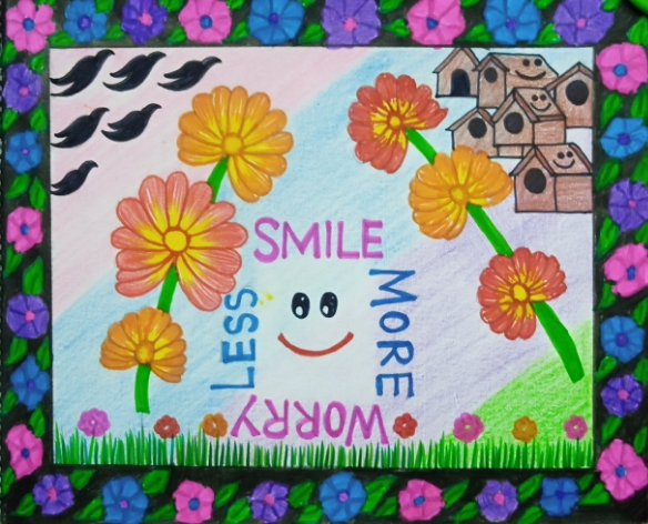 Hello everyone, I am Wania Ammad from Beaconhouse School System, Karachi. I love reading books, swimming and exploring the natural beauty. As painting is the best way to express the feelings that’s why I love to paint and draw as well. This is my 2-D masterpiece. This art piece specifically shows the expression of happiness. As the life of everyone is comprised of happiness, sorrows, smiles and worries. It depends on us, how we are taking it. I think if we smile more, automatically our worries will be less. In this artwork, I drew so many flowers because I think flowers play an important role in showing the expressions of happiness. Birds are free and they are going to their houses to get shelter and food. As Dove is the symbol of peace so my art piece tells us about peace which gives us the eternal happiness.