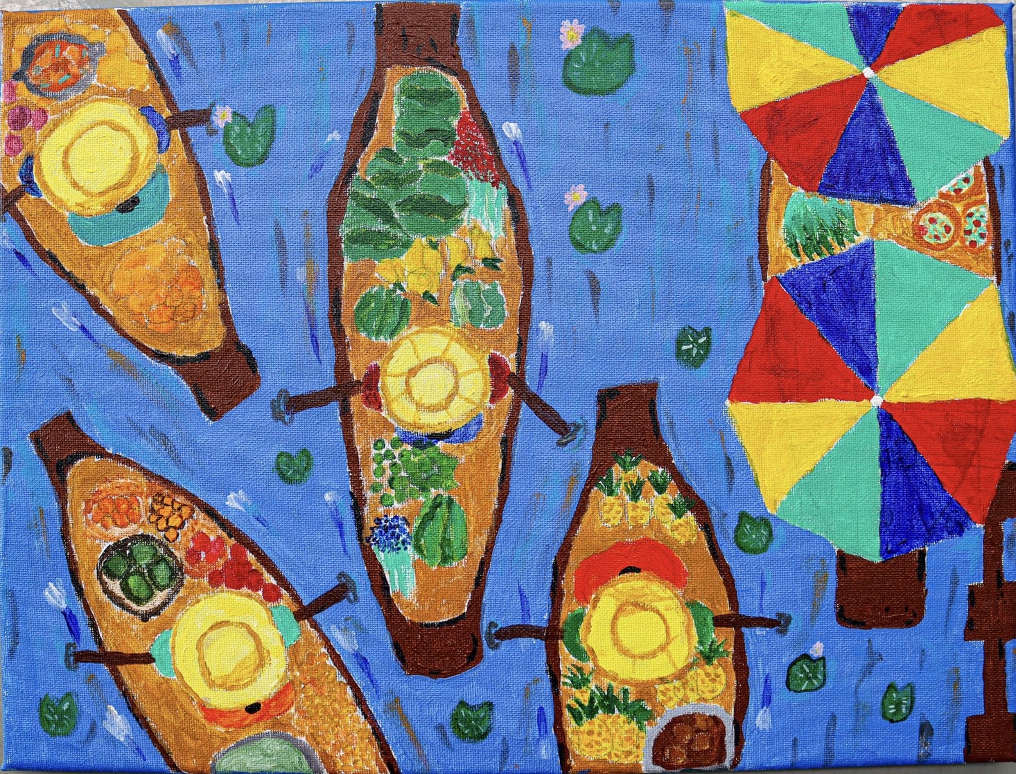 What inspired me to do this artwork was the tourism and traditional means of buying and selling food in Thailand. I painted it so other people can experience and be enlightened about the different things and our country’s culture through my artwork. Floating markets originated in times and places when and where water transport played an important role in daily life. I am very proud that Thailand is keeping and preserving such important culture. It is part of our history and it’s still being practiced. This artwork also shows the abundance of crops, fruits and scrumptious local food that tourists should visit for a lifetime experience.