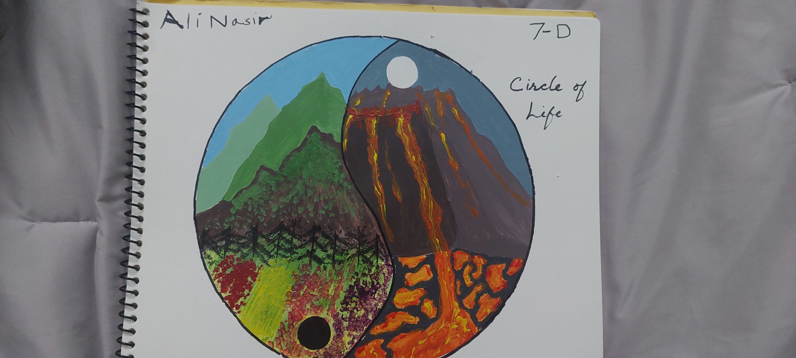 Hello, My name is Mohammad Ali Nasir I represent the class of 7-D. In this art competition I have made a painting called “The circle of life”. This painting has a yinyang depicting two scenarios, one with a beautiful green mountain side & the other showing a volcanic eruption. These two views represent the two main emotions in life. The beautiful mountain side showing happiness and the volcano side showing sadness. the meaning of this painting is, you must live the reality of life to experience the happiness. Both the emotions (forces) always co-exist.