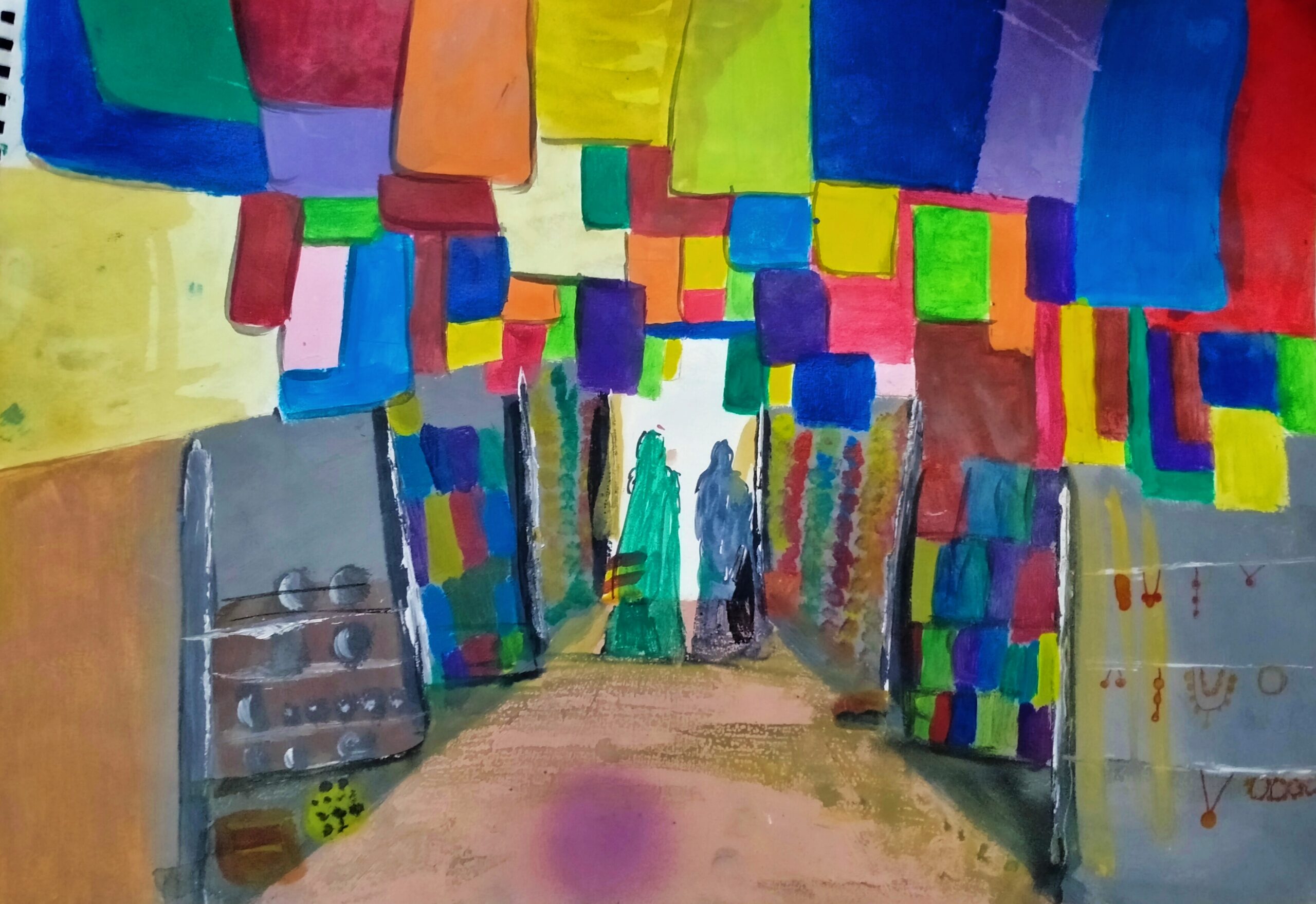 This is a depiction of a cultural market in Pakistan. It shows the different types of items that these diverse sea of shops contain. It also depicts the creativity and cultural heritage of this market. It is an acrylic painting that was created with zeal and zest