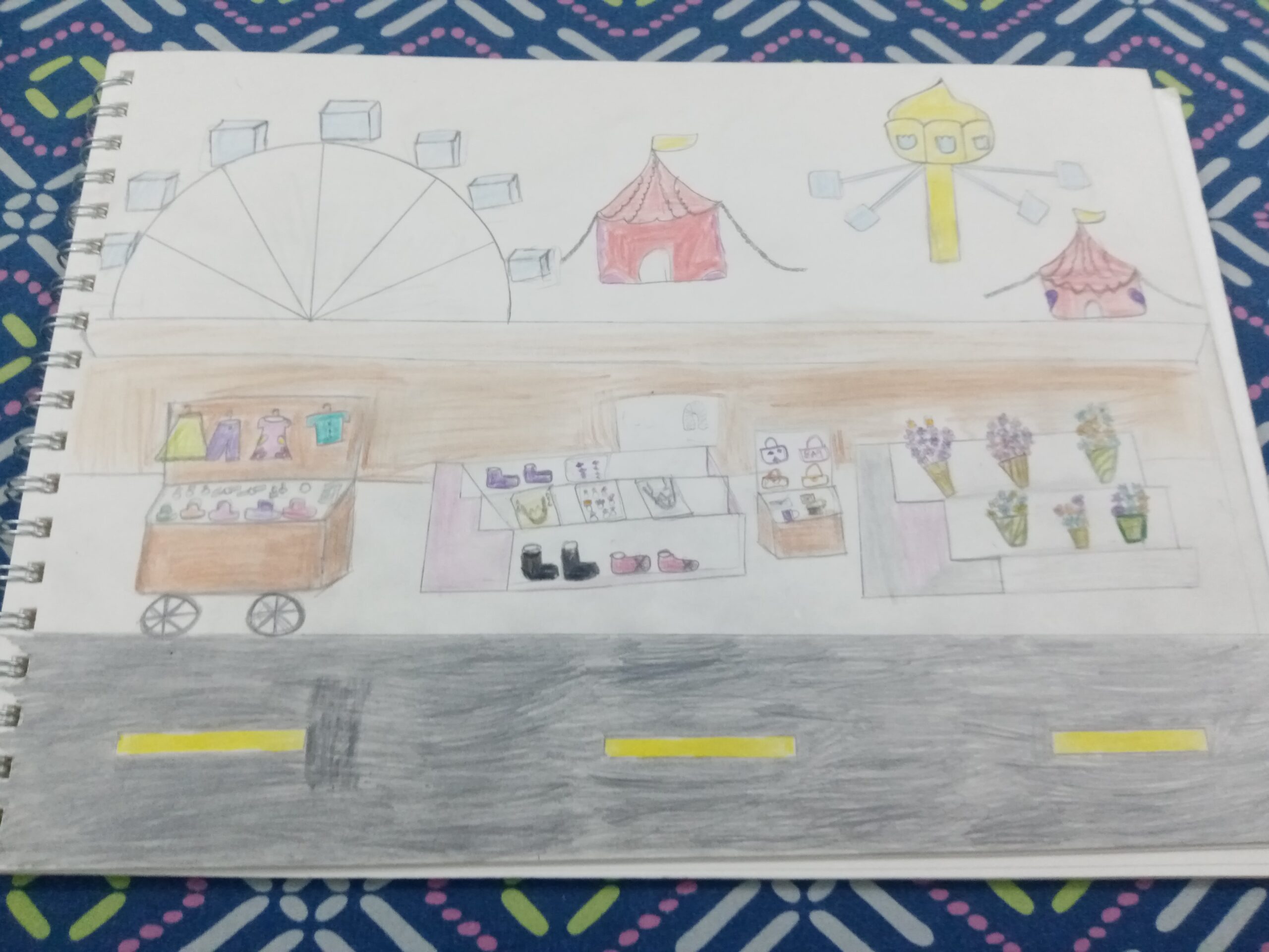 In my 2D painting I am showing a background of an amusement park , the main concept I am showing is that there is road and on foot path people have there small bazaar in which they sell clothes, bags, shoes and more other things. In Pakistan you can easily find road bazaar’s in which people sell things on foot path to make money.