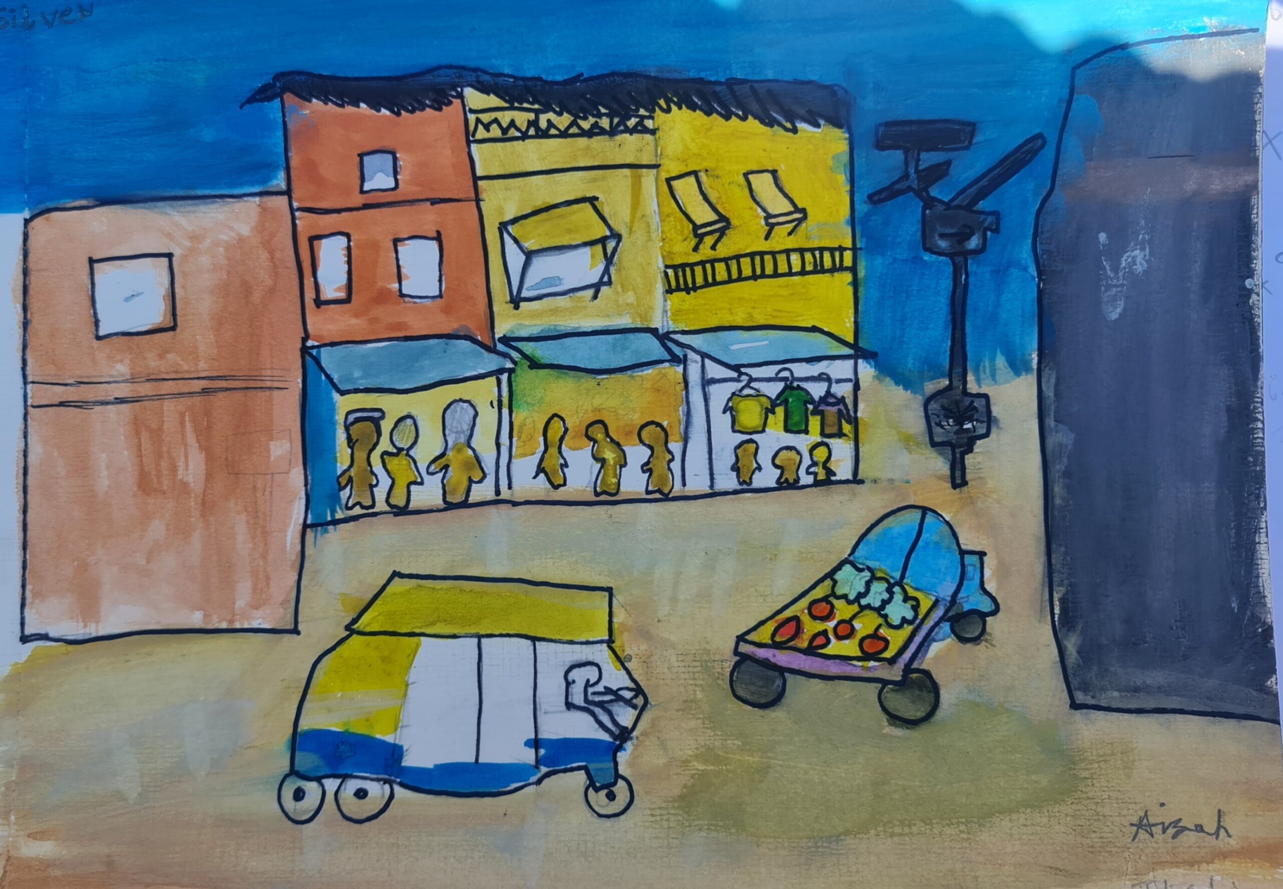 Its a painting about a tradiyional bazar with old buildings and simplicity