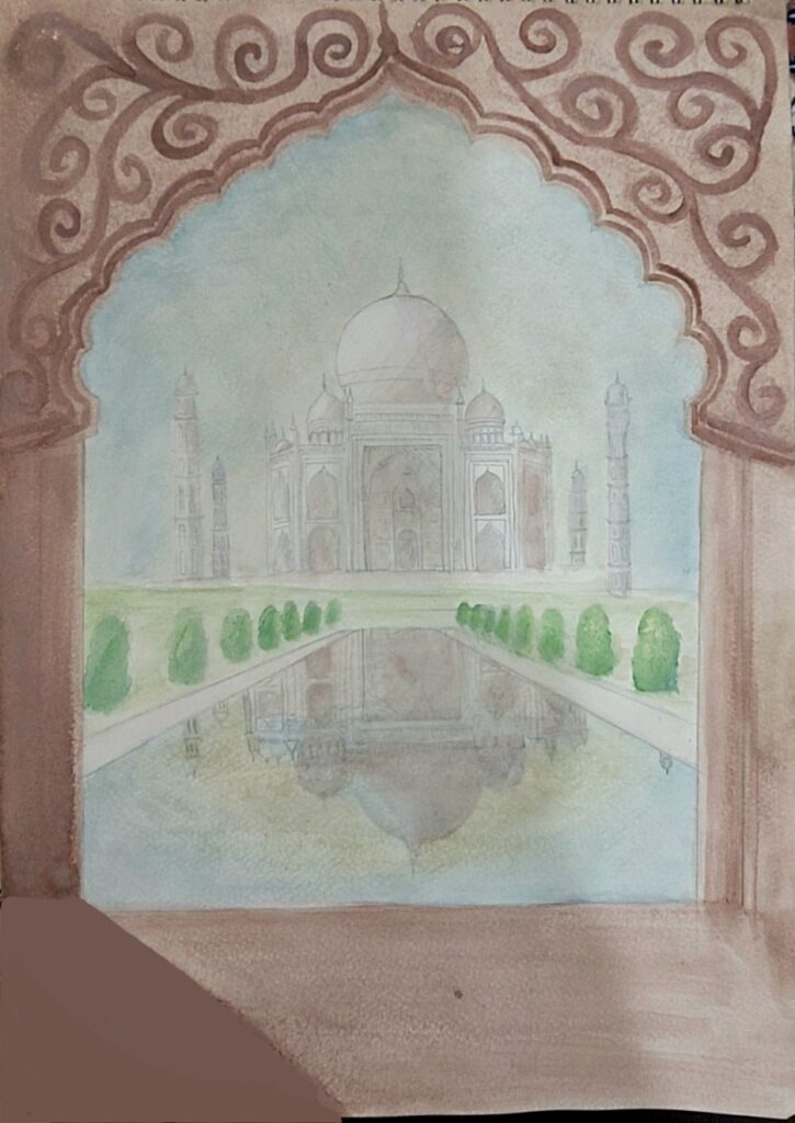 This artwork perfectly expresses the theme, as it features both architecture and reflections. It captures the beauty of the Taj Mahal in the morning light. I used watercolours for most of the painting. The Taj Mahal was originally built with a beautiful backstory. Shah Jahan commissioned it in memory of his beloved wife, Mumtaz Mahal, after her passing. Today, it stands as a symbol of beauty and inspiration for many.