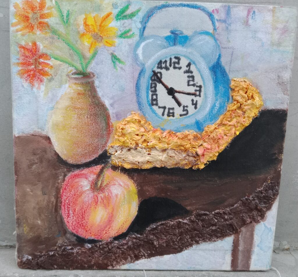 This painting explores the subjective experience of time through a still life imbued with vibrant colour and tactile texture. A whimsical clock, its face playfully imprecise, anchors the composition, symbolising time’s fluid nature rather than its rigid measurement. Wilting flowers and a ripe apple suggest the ephemeral, while a solid vase and table offer a sense of grounding.