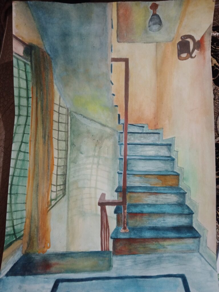 When I use the staircase in my house, the dramatic effect of the light and reflections inspires me to capture the moment using watercolours to create the perfect effect on canvas.